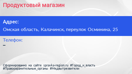 Продуктовый магазин по адресу Омская область, Калачинск, переулок Осминина, 25 в дальнейшем Организация, размещена в следующих категориях: