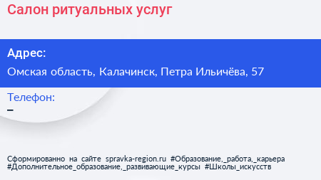 Салон ритуальных услуг по адресу Омская область, Калачинск, Петра Ильичёва, 57 в дальнейшем Организация, размещена в следующих категориях: