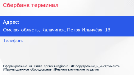 Сбербанк, терминал по адресу Омская область, Калачинск, Петра Ильичёва, 18 в дальнейшем Организация, размещена в следующих категориях: