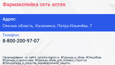 Фармакопейка, сеть аптек по адресу Омская область, Калачинск, Петра Ильичёва, 7 в дальнейшем Организация, размещена в следующих категориях: