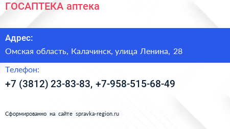 ГОСАПТЕКА, аптека по адресу Омская область, Калачинск, улица Ленина, 28 в дальнейшем Организация, размещена в следующих категориях: