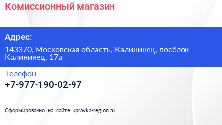 Комиссионный магазин по адресу 143370, Московская область, Калининец, посёлок Калининец, 17а в дальнейшем Организация, размещена в следующих категориях: