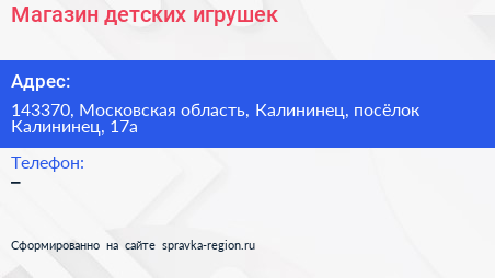 Магазин детских игрушек по адресу 143370, Московская область, Калининец, посёлок Калининец, 17а в дальнейшем Организация, размещена в следующих категориях: