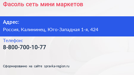 Фасоль, сеть мини-маркетов по адресу Фасоль, 1-я Юго-Западная улица, КИЗ «Зелёная Роща-1», Сивково, Одинцовский городской округ, Московская область, Центральный федеральный округ, 143063, Россия в дальнейшем Организация, размещена в следующих категориях: