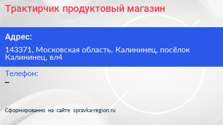 Трактирчик, продуктовый магазин по адресу 143371, Московская область, Калининец, посёлок Калининец, вл4 в дальнейшем Организация, размещена в следующих категориях:
