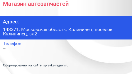 Магазин автозапчастей по адресу 143371, Московская область, Калининец, посёлок Калининец, вл2 в дальнейшем Организация, размещена в следующих категориях: