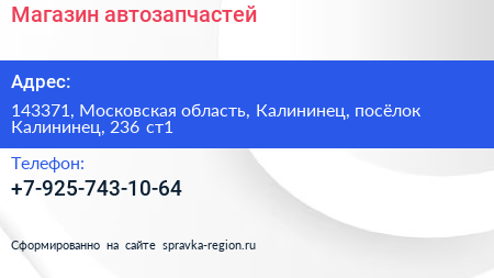 Магазин автозапчастей по адресу 143371, Московская область, Калининец, посёлок Калининец, 236 ст1 в дальнейшем Организация, размещена в следующих категориях: