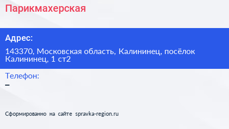 Парикмахерская по адресу 143370, Московская область, Калининец, посёлок Калининец, 1 ст2 в дальнейшем Организация, размещена в следующих категориях: