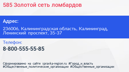 585*Золотой, сеть ломбардов по адресу 236006, Калининградская область, Калининград, Ленинский проспект, 35-37 в дальнейшем Организация, размещена в следующих категориях: