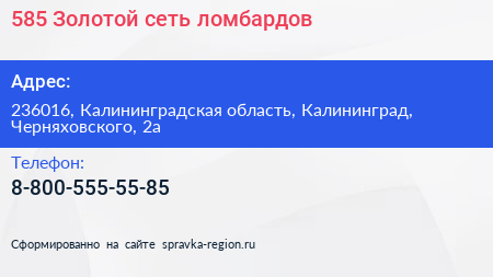 585*Золотой, сеть ломбардов по адресу 236016, Калининградская область, Калининград, Черняховского, 2а в дальнейшем Организация, размещена в следующих категориях: