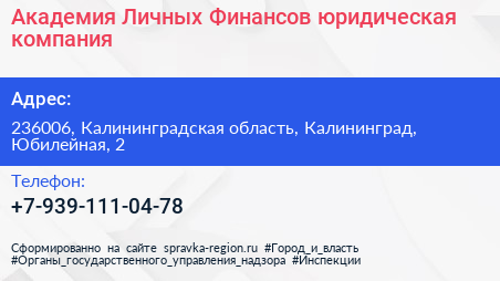 Академия Личных Финансов, юридическая компания по адресу 236006, Калининградская область, Калининград, Юбилейная, 2 в дальнейшем Организация, размещена в следующих категориях: