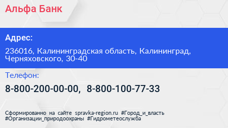 Альфа-Банк по адресу 236016, Калининградская область, Калининград, Черняховского, 30-40 в дальнейшем Организация, размещена в следующих категориях: