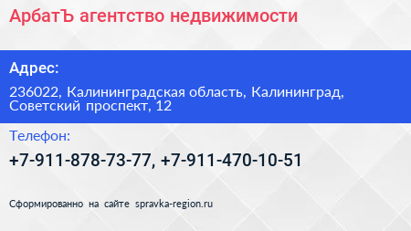 АрбатЪ, агентство недвижимости по адресу 236022, Калининградская область, Калининград, Советский проспект, 12 в дальнейшем Организация, размещена в следующих категориях: