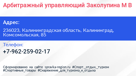 Арбитражный управляющий Заколупина М.В. по адресу 236023, Калининградская область, Калининград, Комсомольская, 85 в дальнейшем Организация, размещена в следующих категориях: