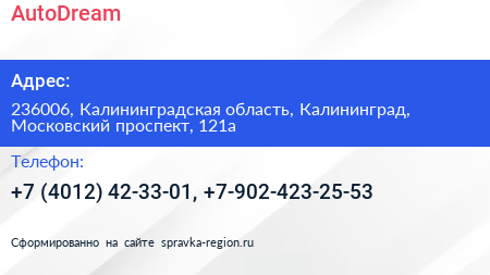 AutoDream по адресу 236006, Калининградская область, Калининград, Московский проспект, 121а в дальнейшем Организация, размещена в следующих категориях: