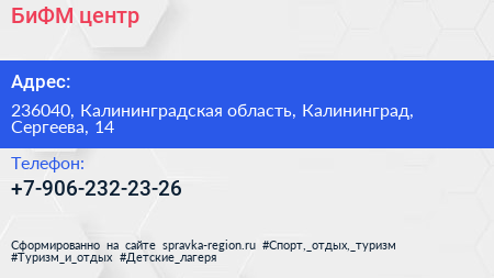 БиФМ-центр по адресу 236040, Калининградская область, Калининград, Сергеева, 14 в дальнейшем Организация, размещена в следующих категориях: