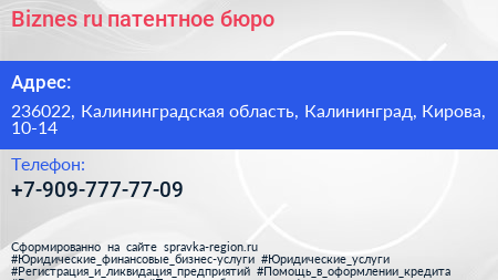 Biznes.ru, патентное бюро по адресу 236022, Калининградская область, Калининград, Кирова, 10-14 в дальнейшем Организация, размещена в следующих категориях: