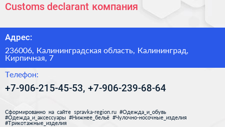 Customs declarant, компания по адресу 236006, Калининградская область, Калининград, Кирпичная, 7 в дальнейшем Организация, размещена в следующих категориях: