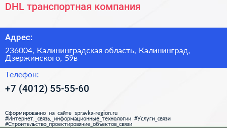 DHL, транспортная компания по адресу 236004, Калининградская область, Калининград, Дзержинского, 59в в дальнейшем Организация, размещена в следующих категориях: