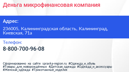 Деньга, микрофинансовая компания по адресу 236005, Калининградская область, Калининград, Киевская, 71а в дальнейшем Организация, размещена в следующих категориях: