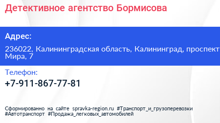 Детективное агентство Бормисова по адресу 236022, Калининградская область, Калининград, проспект Мира, 7 в дальнейшем Организация, размещена в следующих категориях: