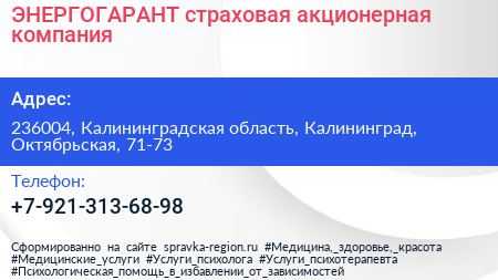 ЭНЕРГОГАРАНТ, страховая акционерная компания по адресу 236004, Калининградская область, Калининград, Октябрьская, 71-73 в дальнейшем Организация, размещена в следующих категориях: