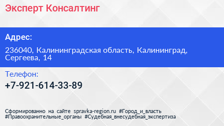Эксперт Консалтинг по адресу 236040, Калининградская область, Калининград, Сергеева, 14 в дальнейшем Организация, размещена в следующих категориях: