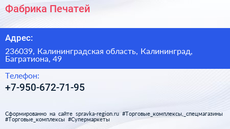 Фабрика Печатей по адресу 236039, Калининградская область, Калининград, Багратиона, 49 в дальнейшем Организация, размещена в следующих категориях: