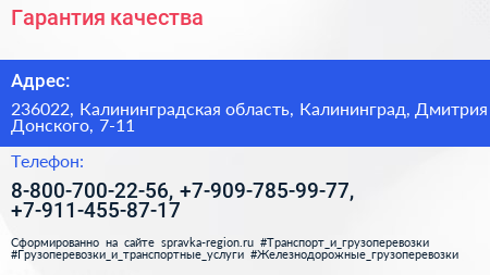 Гарантия качества по адресу 236022, Калининградская область, Калининград, Дмитрия Донского, 7-11 в дальнейшем Организация, размещена в следующих категориях: