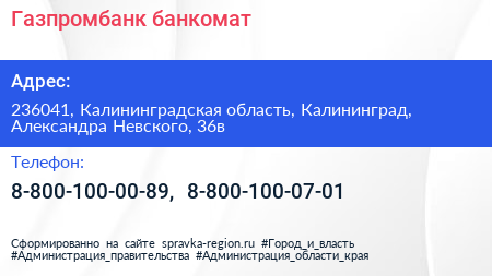 Газпромбанк, банкомат по адресу 236041, Калининградская область, Калининград, Александра Невского, 36в в дальнейшем Организация, размещена в следующих категориях: