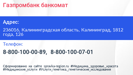 Газпромбанк, банкомат по адресу 236016, Калининградская область, Калининград, 1812 года, 126 в дальнейшем Организация, размещена в следующих категориях: