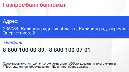 Газпромбанк, банкомат по адресу 236034, Калининградская область, Калининград, переулок Энергетиков, 2 в дальнейшем Организация, размещена в следующих категориях: