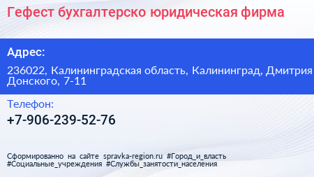 Гефест, бухгалтерско-юридическая фирма по адресу 236022, Калининградская область, Калининград, Дмитрия Донского, 7-11 в дальнейшем Организация, размещена в следующих категориях: