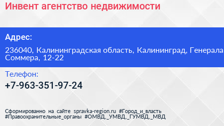 Инвент, агентство недвижимости по адресу 236040, Калининградская область, Калининград, Генерала Соммера, 12-22 в дальнейшем Организация, размещена в следующих категориях: