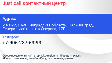 Just call, контактный центр по адресу 236022, Калининградская область, Калининград, Генерал-лейтенанта Озерова, 17Б в дальнейшем Организация, размещена в следующих категориях: