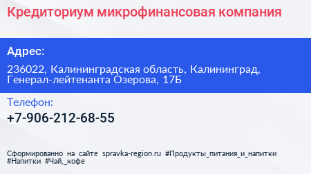 Кредиториум, микрофинансовая компания по адресу 236022, Калининградская область, Калининград, Генерал-лейтенанта Озерова, 17Б в дальнейшем Организация, размещена в следующих категориях: