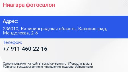 Ниагара, фотосалон по адресу 236010, Калининградская область, Калининград, Менделеева, 2-6 в дальнейшем Организация, размещена в следующих категориях:
