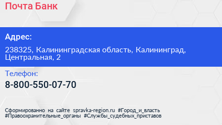 Почта Банк по адресу 238325, Калининградская область, Калининград, Центральная, 2 в дальнейшем Организация, размещена в следующих категориях: