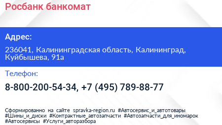Росбанк, банкомат по адресу 236041, Калининградская область, Калининград, Куйбышева, 91а в дальнейшем Организация, размещена в следующих категориях: