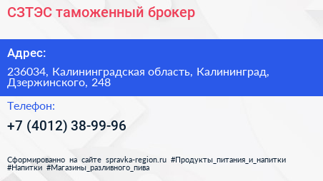 СЗТЭС, таможенный брокер по адресу 236034, Калининградская область, Калининград, Дзержинского, 248 в дальнейшем Организация, размещена в следующих категориях: