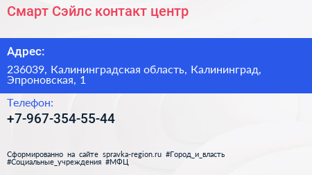 Смарт Сэйлс, контакт-центр по адресу 236039, Калининградская область, Калининград, Эпроновская, 1 в дальнейшем Организация, размещена в следующих категориях: