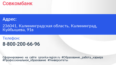 Совкомбанк по адресу 236041, Калининградская область, Калининград, Куйбышева, 91в в дальнейшем Организация, размещена в следующих категориях: