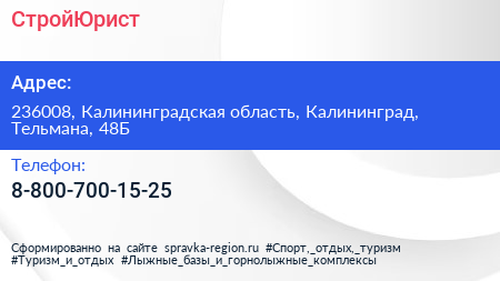 СтройЮрист по адресу 236008, Калининградская область, Калининград, Тельмана, 48Б в дальнейшем Организация, размещена в следующих категориях: