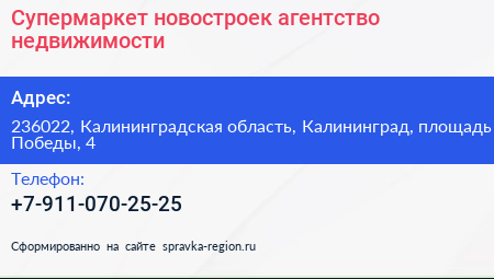 Супермаркет новостроек, агентство недвижимости по адресу 236022, Калининградская область, Калининград, площадь Победы, 4 в дальнейшем Организация, размещена в следующих категориях: