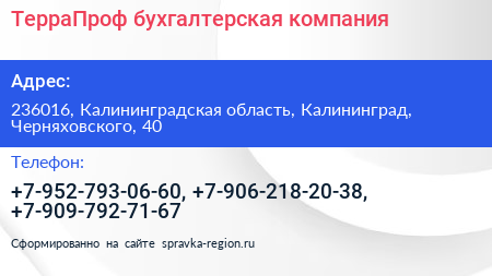 ТерраПроф, бухгалтерская компания по адресу 236016, Калининградская область, Калининград, Черняховского, 40 в дальнейшем Организация, размещена в следующих категориях: