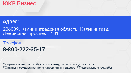 ЮКВ-Бизнес по адресу 236039, Калининградская область, Калининград, Ленинский проспект, 131 в дальнейшем Организация, размещена в следующих категориях: