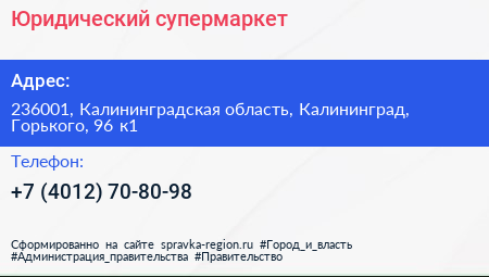 Юридический супермаркет по адресу 236001, Калининградская область, Калининград, Горького, 96 к1 в дальнейшем Организация, размещена в следующих категориях:
