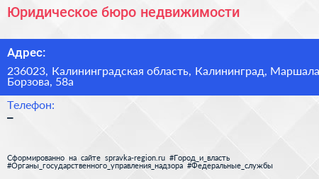 Юридическое бюро недвижимости по адресу 236023, Калининградская область, Калининград, Маршала Борзова, 58а в дальнейшем Организация, размещена в следующих категориях: