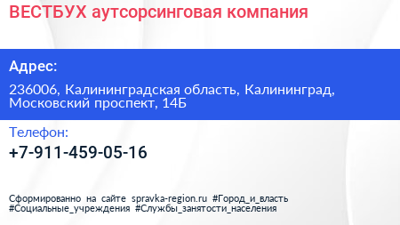 ВЕСТБУХ, аутсорсинговая компания по адресу 236006, Калининградская область, Калининград, Московский проспект, 14Б в дальнейшем Организация, размещена в следующих категориях: