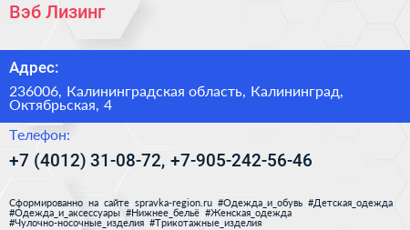 Вэб-Лизинг по адресу 236006, Калининградская область, Калининград, Октябрьская, 4 в дальнейшем Организация, размещена в следующих категориях: